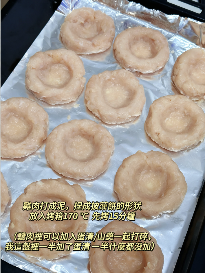 將雞胸肉與少量蛋清一同打成泥狀,均勻鋪在烤盤上壓平成餅狀,並塑形為披薩底的樣式,放入烤箱以 170℃烘烤 15 分鐘。