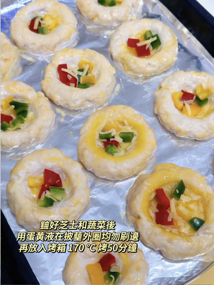 在烤好的披薩底上均勻鋪滿起司碎與切好的蔬菜,披薩邊緣則均勻塗抹上蛋黃液。