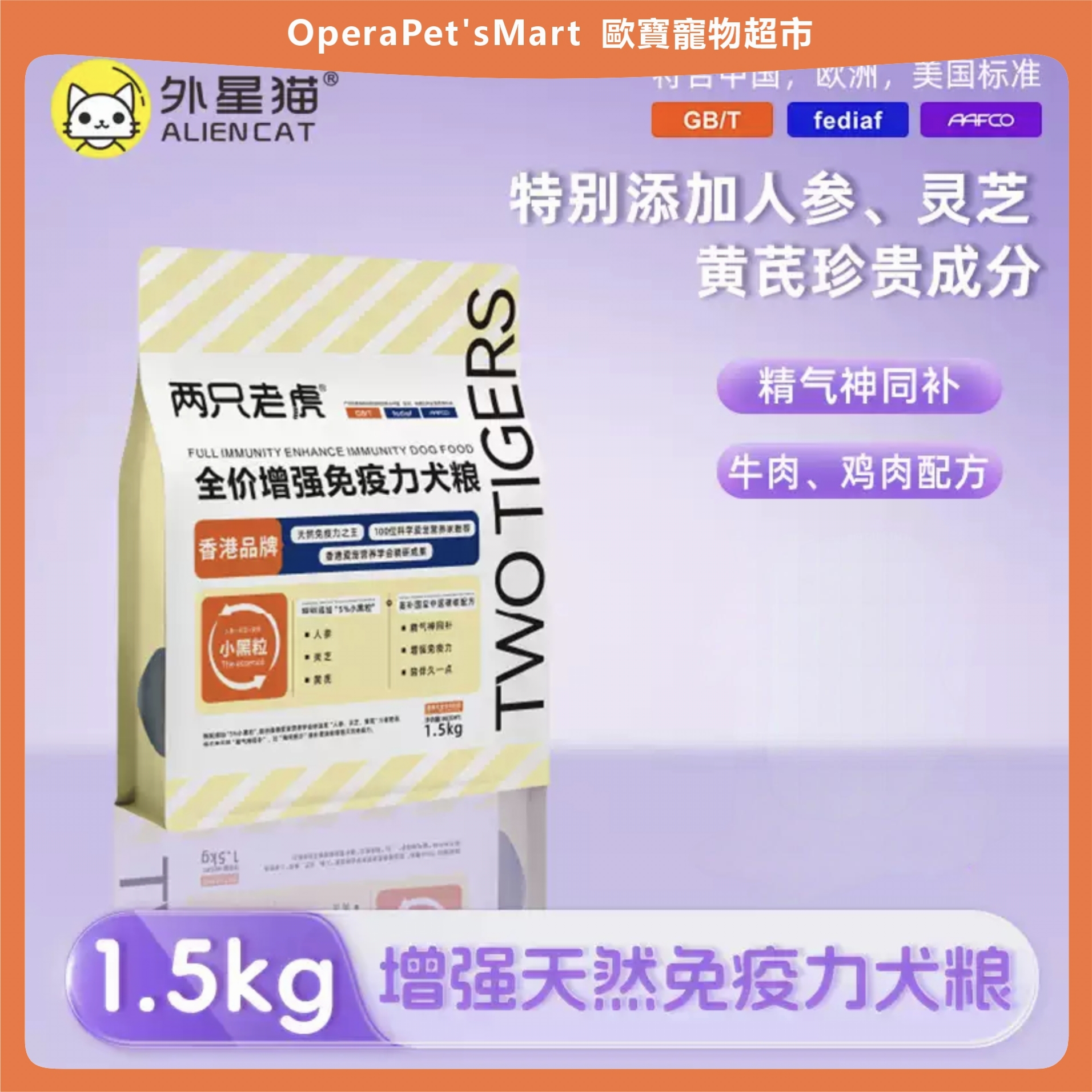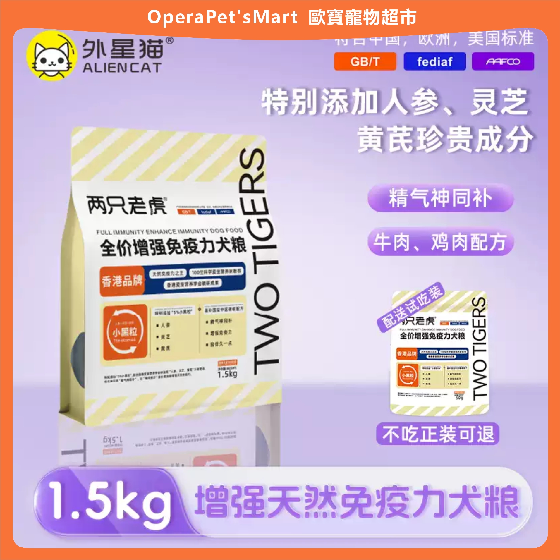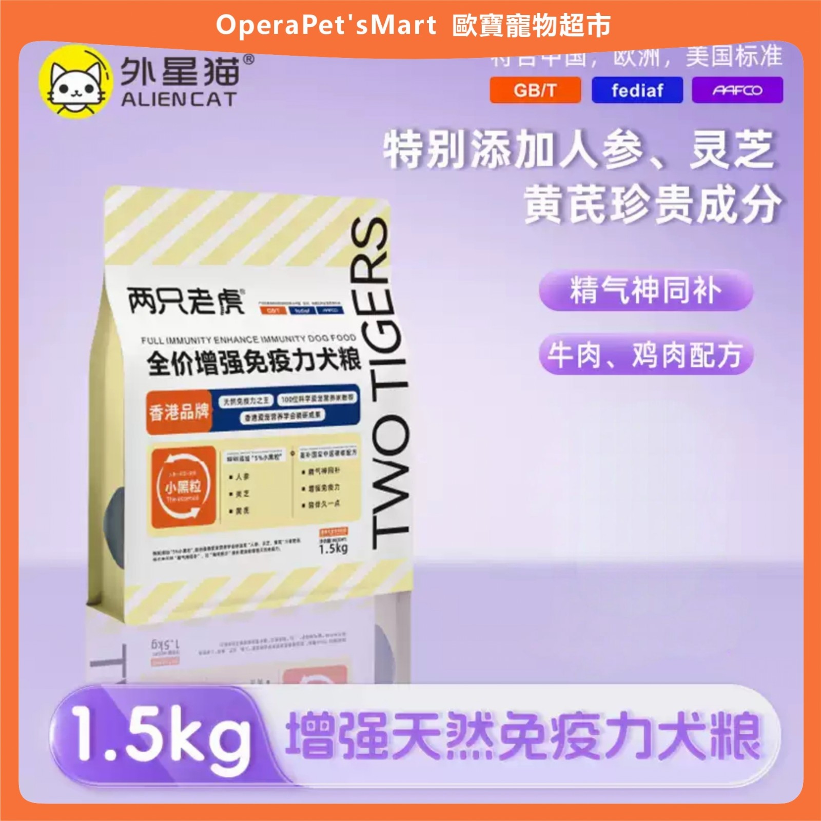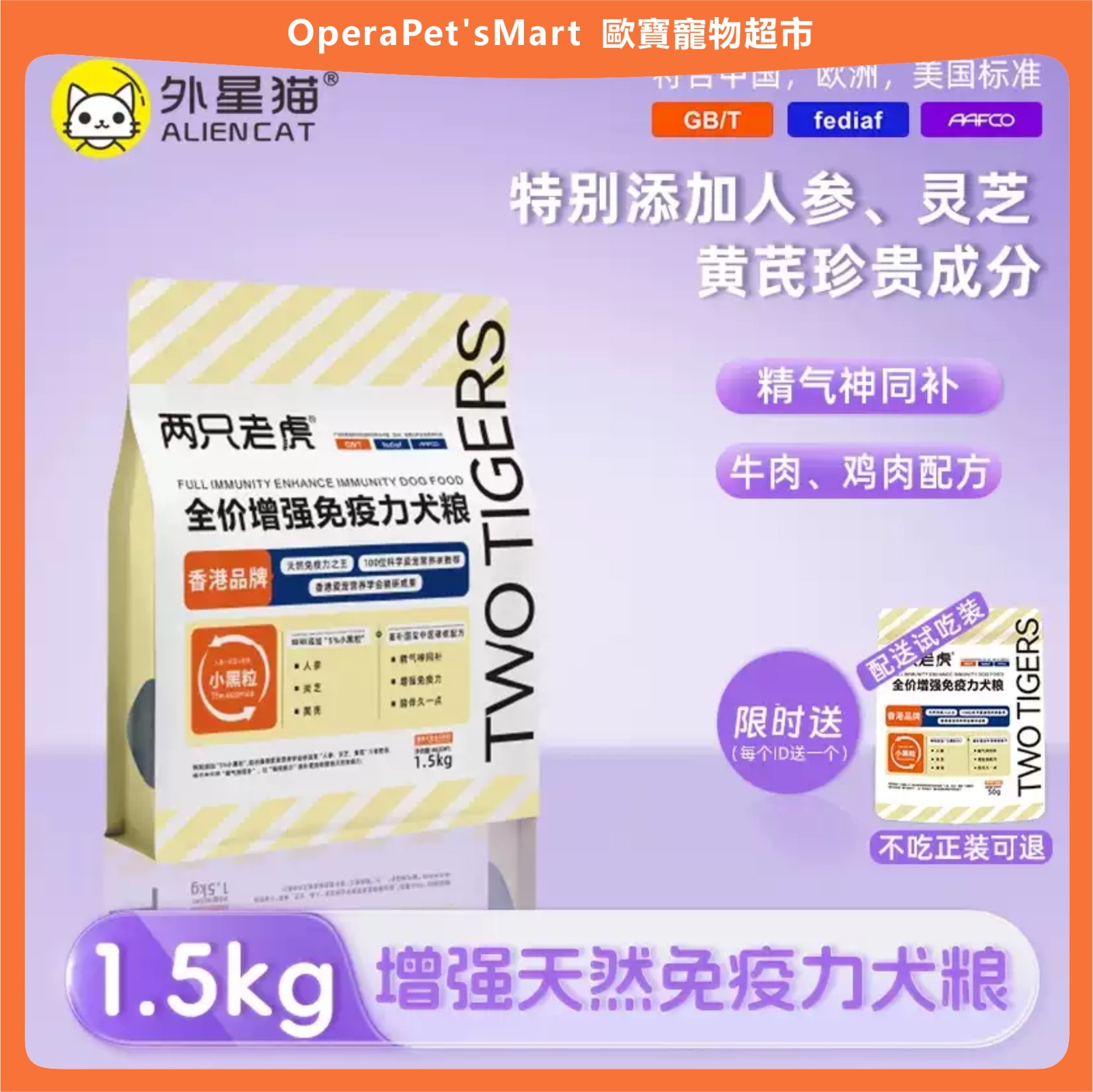 乾糧 品牌 ALIEN CAT/外星貓 品名 全價增強兔疫力犬糧 功效 調理腸胃 儲存條件 常溫 食品口味 增強兔疫力犬糧 生產許可證號/進口登記證號 魯飼證(2019)17032 原產地 中國 保質期 18個月 是否進口 否 淨含量 1.5kg 5kg 犬主糧分類 適用犬體型 通用型 適用階段 全犬期 規格類型 正常規格 生產廠家名稱 菏澤佳諾佳寵物用品有限公司
