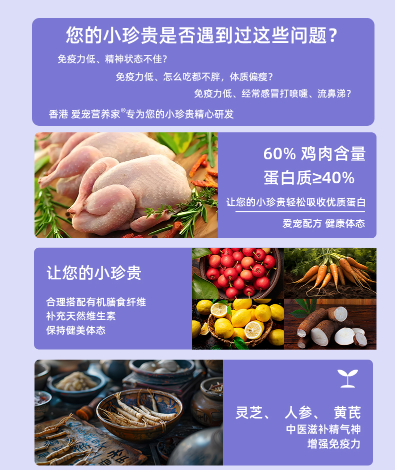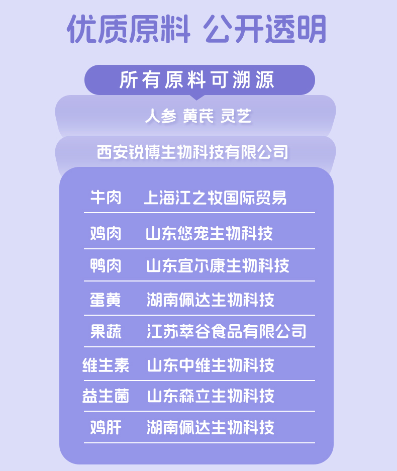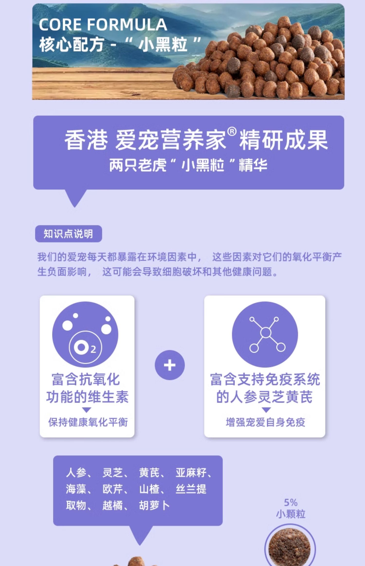 | 功效 | 調理腸胃 營養滋補 美毛護膚 提升免疫 抗衰老 絕育呵護 |
