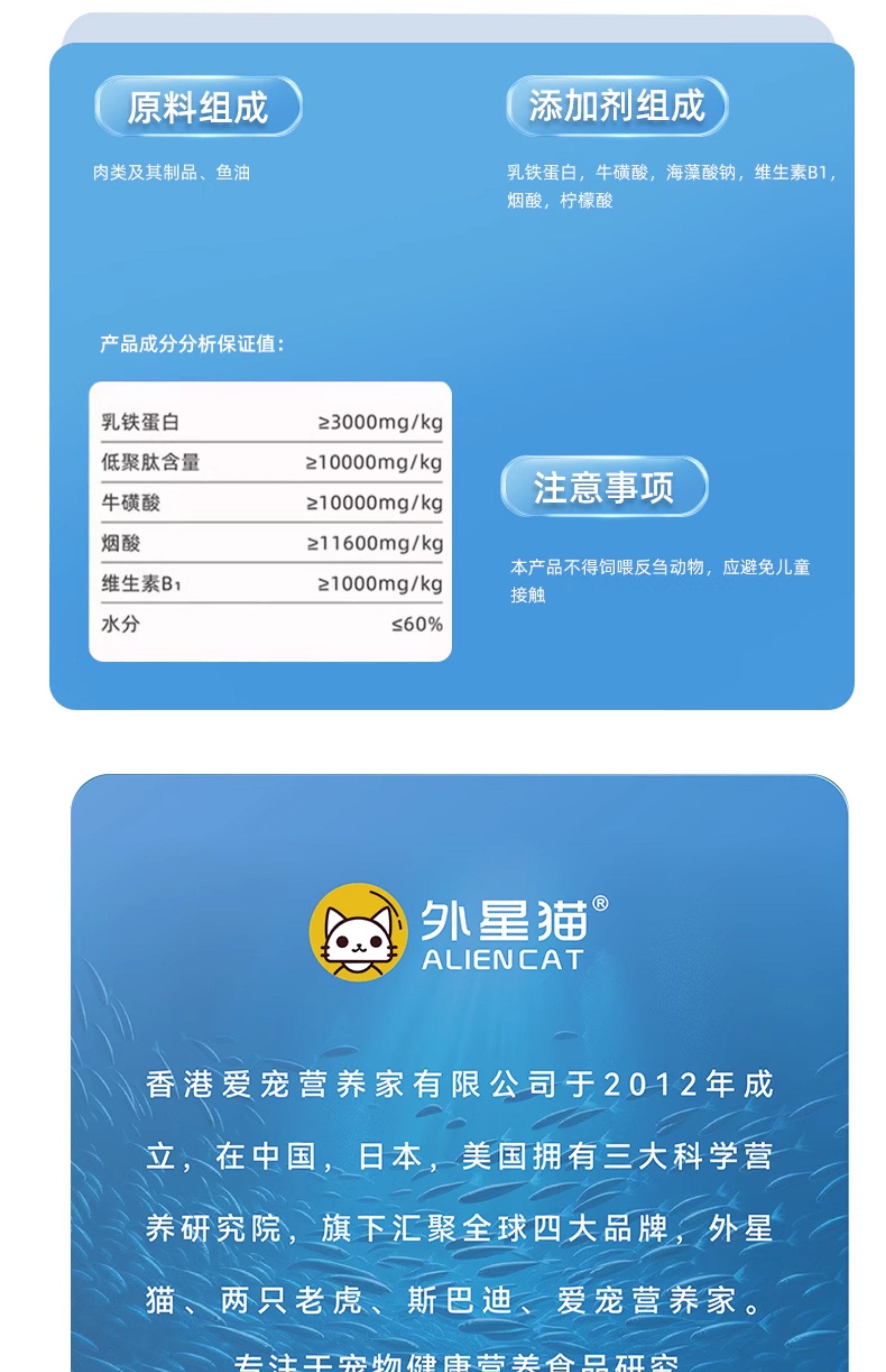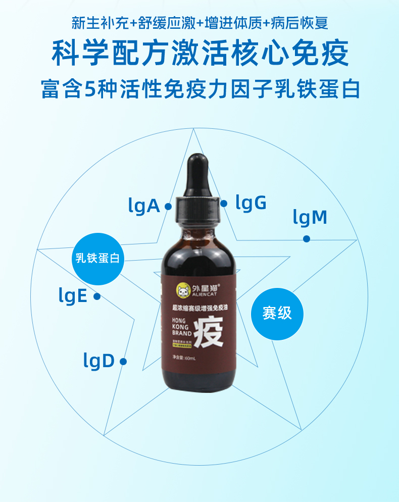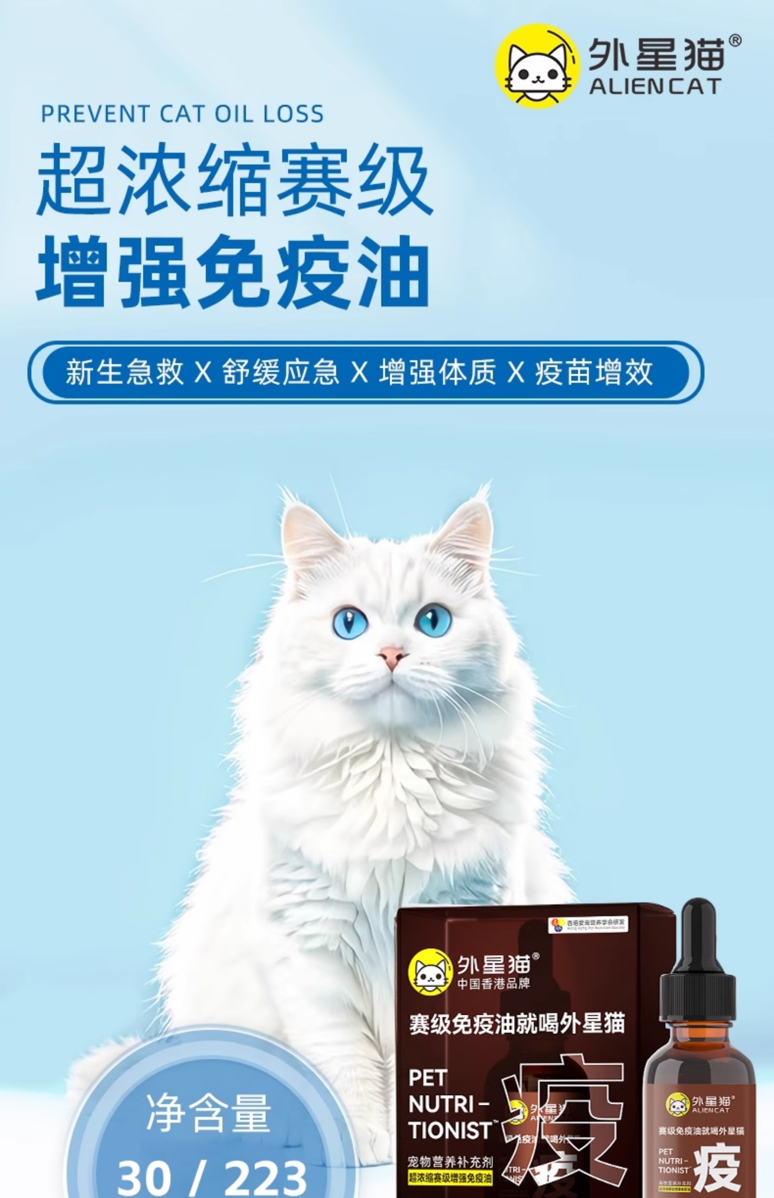 品牌 ALIEN CAT/外星貓 品名 增強免疫油 功效 增強免疫 儲存條件 避光避濕 物理形態 液體 食品口味 賽級增強免疫 原產地 中國 用法 內服 淨含量 30ml 60ml 223ml 規格類型 正常規格 生產廠家位址 香港九龍尖沙咀漆成道南87-105號百利商業中心17/F 生產廠家名稱 外星貓